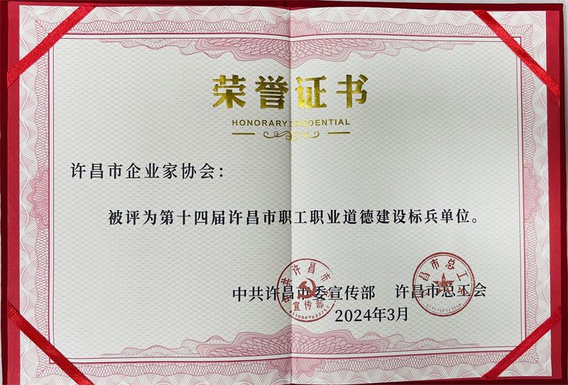 3月27日,許昌市企業(yè)家協(xié)會(huì)被中共許昌市委宣傳部、許昌市總工會(huì)評(píng)為“第十四屆許昌市職工職業(yè)道德建設(shè)標(biāo)兵單位”。
