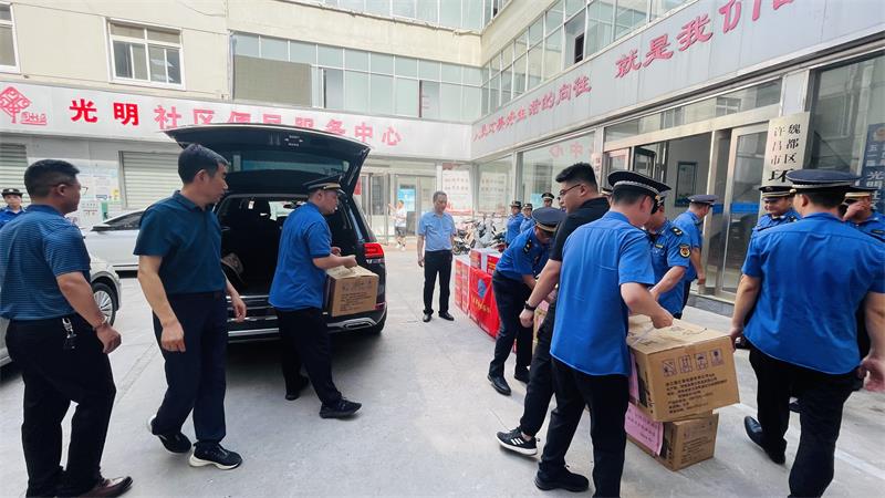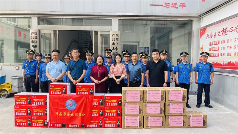 7月24日上午,冒著炎炎酷暑,協(xié)會秘書長黃玉霞、七月份值班會長婁玉陣、副值班會長張?zhí)┟?、古井貢酒鄭豪?人來到許昌市魏都區(qū)城市管理綜合執(zhí)法大隊,送去娃哈哈礦泉水、洗衣液等慰問品,致敬魏都城管。