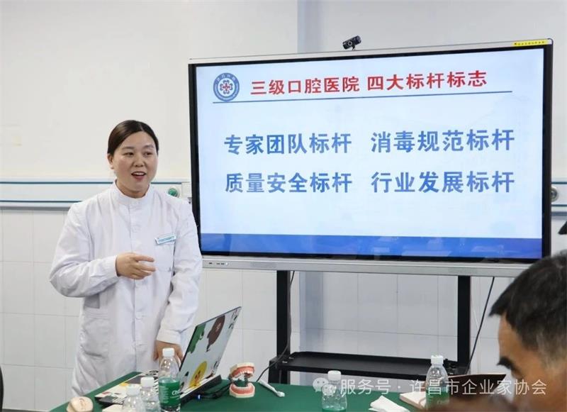 會議特別邀請許昌皓博口腔醫(yī)院醫(yī)務(wù)科科長王川為與會企業(yè)家?guī)?口腔保健知識"專題分享。王川從專業(yè)角度深入淺出地講解了口腔健康的重要性、口腔與全身健康的關(guān)聯(lián)、日??谇蛔o(hù)理要點(diǎn)以及醫(yī)療無菌操作規(guī)范等內(nèi)容,為企業(yè)家們上了一堂生動的健康管理課。